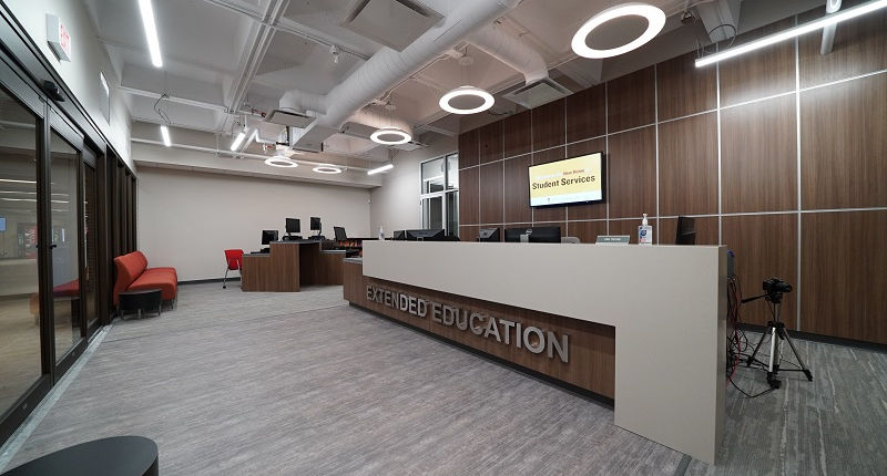 Interior Renovations and upgrades to the Extended Education building including, asbestos abatement, selective demolition, and architectural finishes to the reception area, office areas, washrooms and public spaces. Work was completed while the building remain occupied